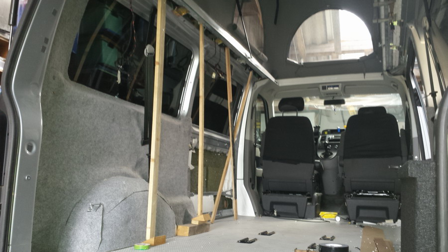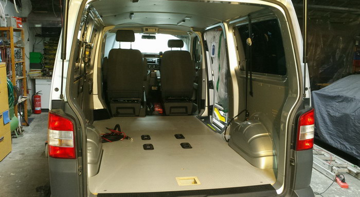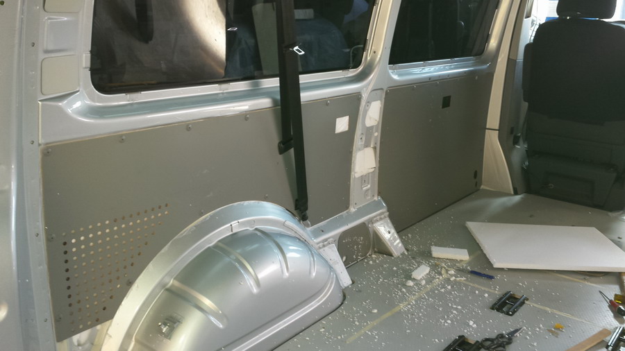 Schon vom Hersteller wurde der T 5.2 als Büro- bzw. Arbeitsfahrzeug für das BAG umfangreich isoliert, ähnlich der Multivan- oder California-Ausstattung. Zur Verbesserung der vorhandenen Isolierung musste die Einrichtung wieder ausgebaut und die komplette Innenverkleidung einschließlich des Bodens entfernt werden.