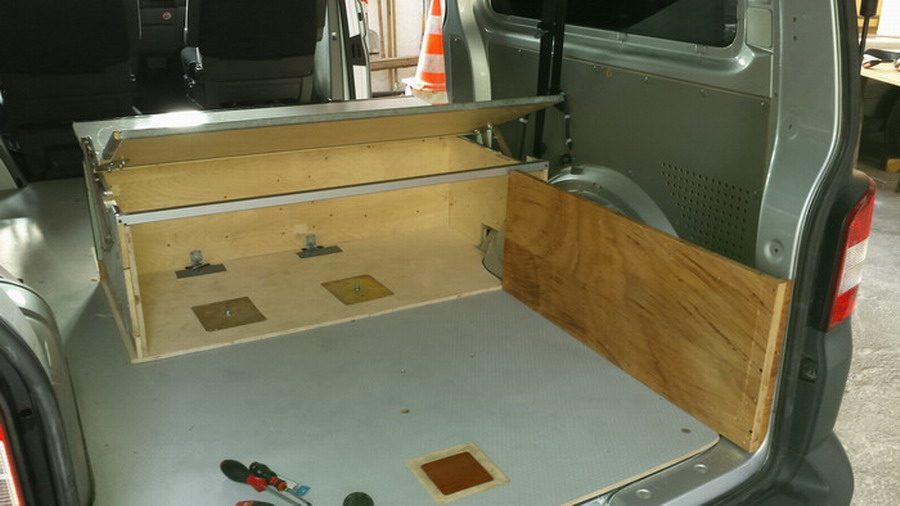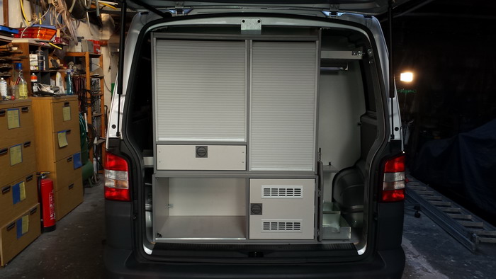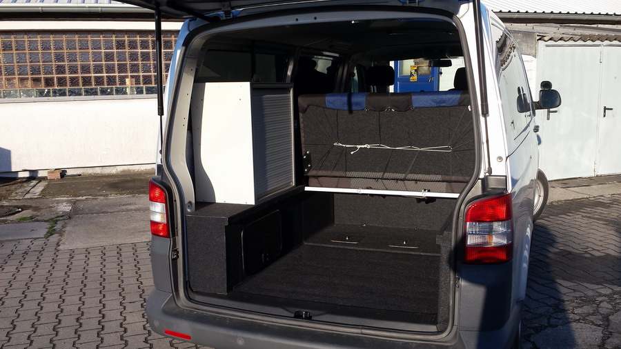 Der vollständige Umbau ist mit etwas Übung in wenigen Minuten zu erledigen und so wird aus dem „Transportfahrzeug“ ein multivariables „Freizeitfahrzeug“ oder ein Arbeitsvan. Von außen nicht erkennbar.
