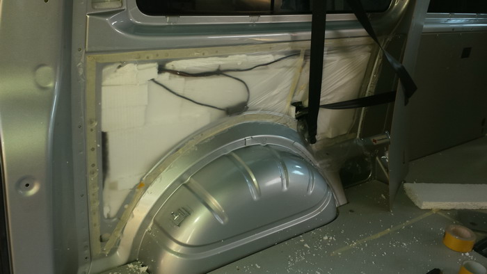 Danach wurde die original Innenverkleidung wieder eingebaut. Nachdem der Heckraum isoliert wurde, erfolgte die demontage der vorderen Wandverkleidung. Auch hier wurden Hohlräume so weit wie möglich nachisoliert und die bestehende Dämmung durch mehrlagige Styroporisolierung verbessert.