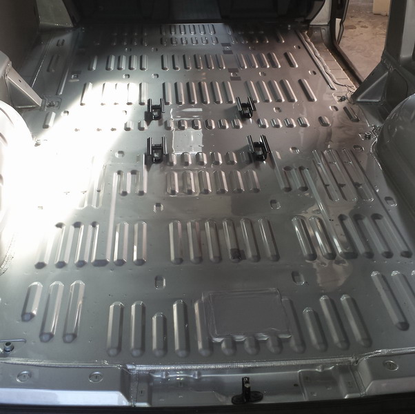 Der Boden unter der beschichteten Multiplexplatte wurde auf Beschädigungen und Korrosion geprüft und gesäubert. Die Isolierung des Fahrzeugbodens erfolgte mit Rollendämmstoff, der zweischichtig mit Doppelklebeband aufgeklebt wurde. (PE-Schaum, Brandklasse EN13501-1E, Wärmedurchlasswiderstand ca. 0,065 m²K/W, Schalldämmung - 16 db je Schicht !!)