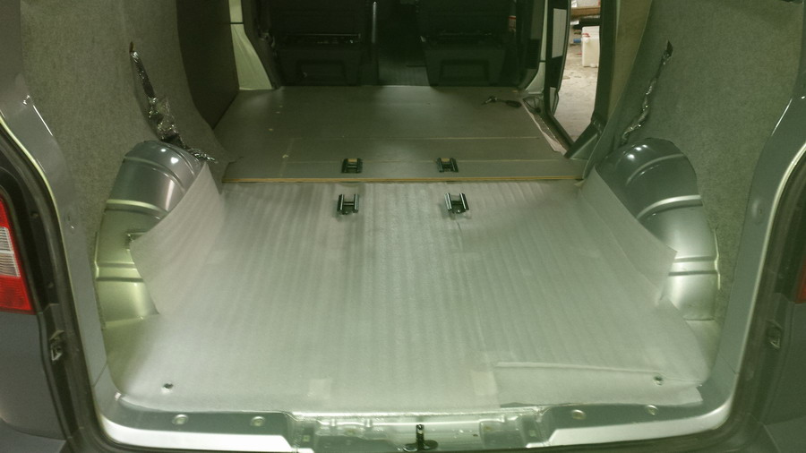 Zur Oberflächenisolierung und als weiterer zusätzlicher Schallschutz wurde der Innenraum danach mit Rips/Nadelfilz-Bodenbelag beklebt.