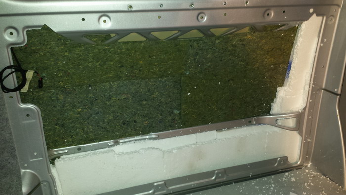 Leider stellte sich nach Entfernung der Verkleidungen heraus, dass die serienmäßige Innendämmung, bestehend aus verklebten Filz-Matten, sich teilweise gelöst hat und abgefallen war. Die heruntergefallenen Matten wurden, jetzt mit Acryl-Klebstoff neu befestigt. (Keinen Silikon-Klebstoff verwenden !!)