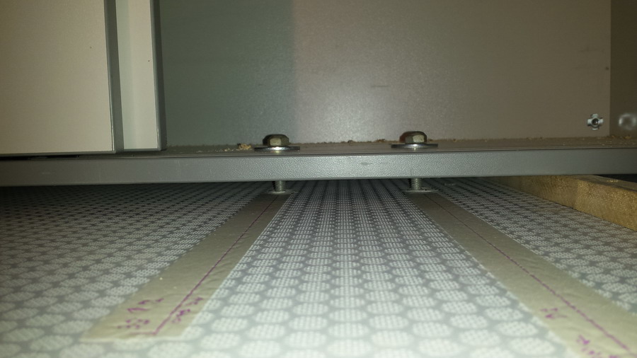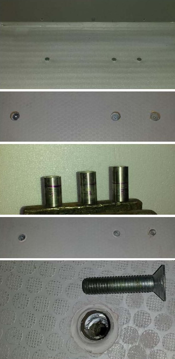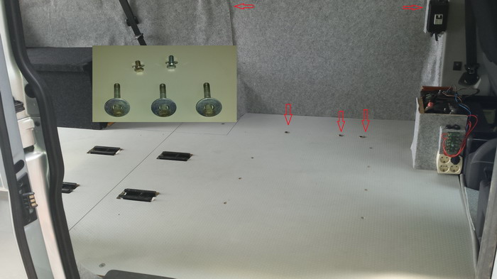 Im Fahrzeugboden befinden sich Verankerungspunkte der ehemaligen BAG-Büroeinrichtung, die für die Verschraubung des Küchenblocks genutzt werden sollten. Die Originalverankerung ist mit Verstärkungsplatten under dem Fahrzeugboden gesichert. Durch Einbau der Isolierung und der Multiplexplatte entstand ein (gedämmter) Hohlraum zwischen Fahrzeugboden und Multiplexplatte. Dieser Hohlraum wurde, wie auf den nachfolgenden Bildern erkennbar ist, durch verklebte Stahl-Distanzhülsen stabilisiert, so dass bei späterem Einbau des Küchenblocks die Isolierung nicht zusammengedrückt weden kann und die Verankerung der Möbel sicher ist.