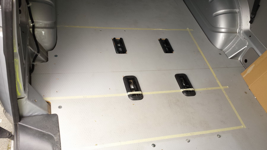 Um sichere Befestigung zu gewährleisten sollten Sitzbank und Möbel möglichst an Original-Verankerungspunkten oder mit stabilen Nietmuttern befestigt werden. So ist auch ein problemloser und schneller Ausbau der Einrichtung gewährleistet. Um einen Überblick zu erhalten wurden die Umrisse zunächst durch Klebeband markiert.