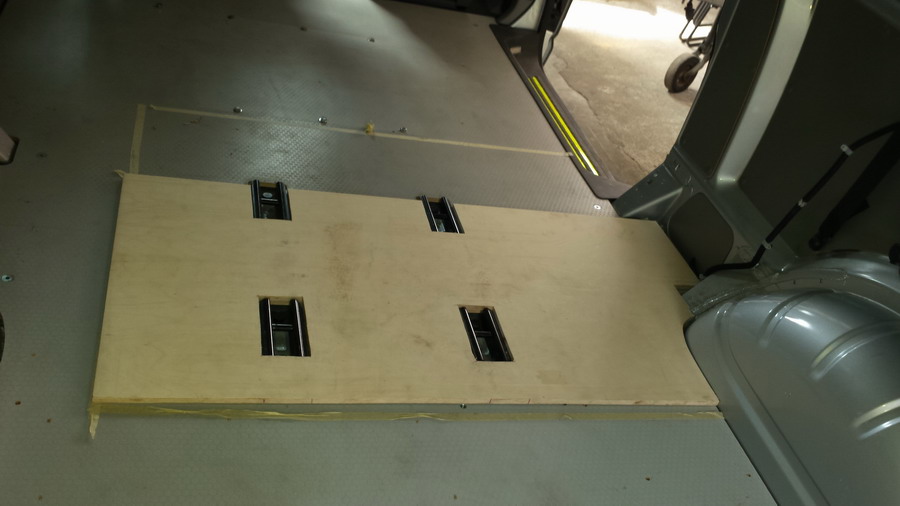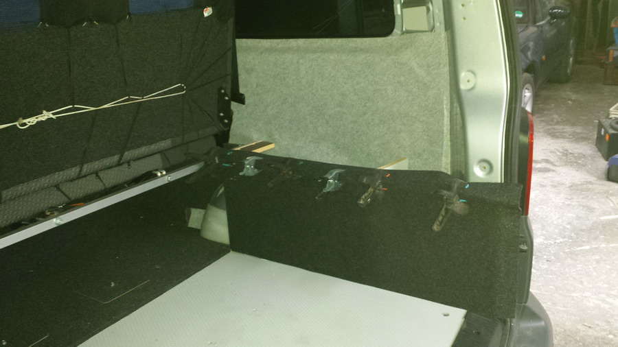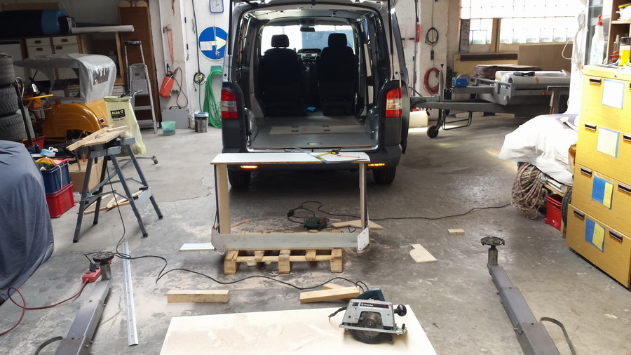Die Sitzbank wurde probeweise an den vorbereiteten Verankerungspunkten befestigt und der weitere Ausbau im Heckbereich wurde vorbereitet. Hinter der Sitzbank wurde eine stabile Zwischenwand, bestehend aus einer Tischlerplatte vorbereitet, die als Auflage der Matratzenunterlage im Heck dienen soll. Die Platte wird im Fahrzeugboden verschraubt, nach vorn wird sie mit einer Trennwand über dem Radkasten verankert, hinten erfolgt die Befestigung direkt an der D-Säule des Fahrzeugs.
