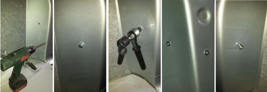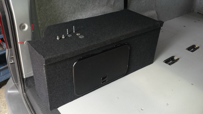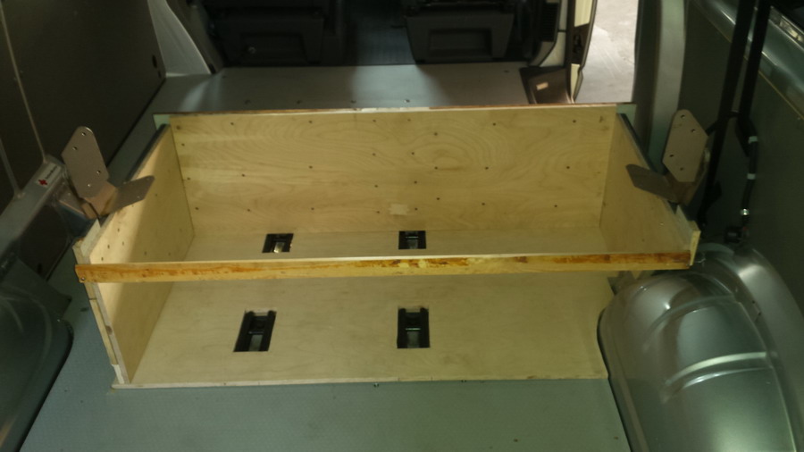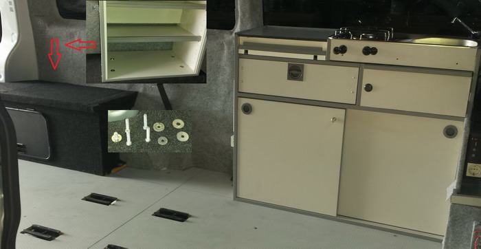 Auf den nun folgenden Bildern ist der Einbau der Campingeinrichtung zu sehen. Beginnend mit dem Stauschrank hinten links über dem Radkasten. Seitlich sind zwei Nietmuttern zur Befestigung erkennbar, zusätzlich befinden sich zwei Verschraubungen im Boden.