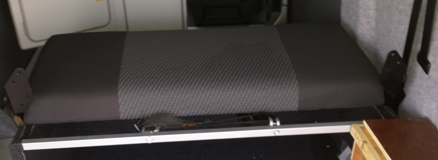 Der untere Teil des BAG-Heckschranks diente nur vorläufig als Unterschrank für die hintere Matratzenauflage. Die serienmäßige mittlere Sitzbank, (drei Sitzplätze) ist klappbar und diente vorläufig als Unterlage für den vorderen Matratzenteil. So entsteht eine vorläufige Liegefläche.