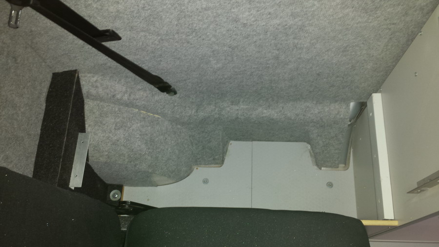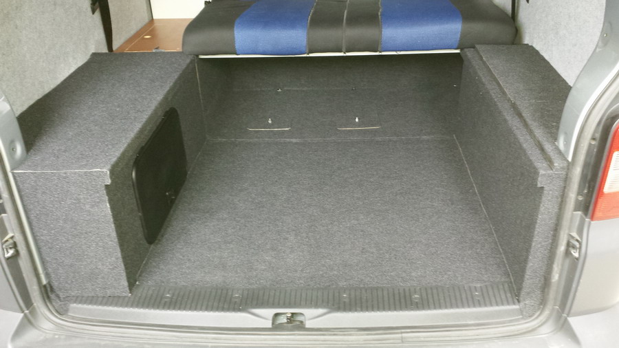 Der Boden wird später mit Rips-Bodenbelag verkleidet, so ist dieser Stauraum nicht sofort als solcher erkennbar.