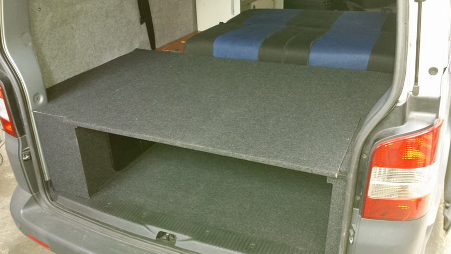 Der hintere Bereich des Stauraums kann mit einer stabilen Platte abgedeckt werden. Sie dienst als Unterlage für die Heckmatratze.