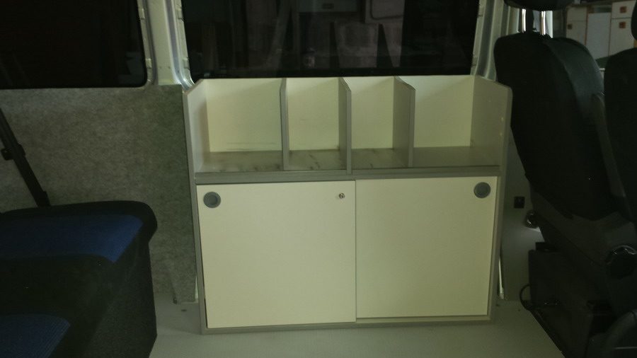Nachdem nun die elektrische Anlage optimiert war, wurden hinter dem Heckschrank, hinten links, noch zusätzliche Ablagefächer eingebaut sowie eine Halterung für einen weiteren Feuerlöscher. Ein praktisches Tablett, während der Fahrt auch als "Tisch" zwischen Fahrer- und Beifahrersitz zu nutzen fehlt nun auch nicht mehr.