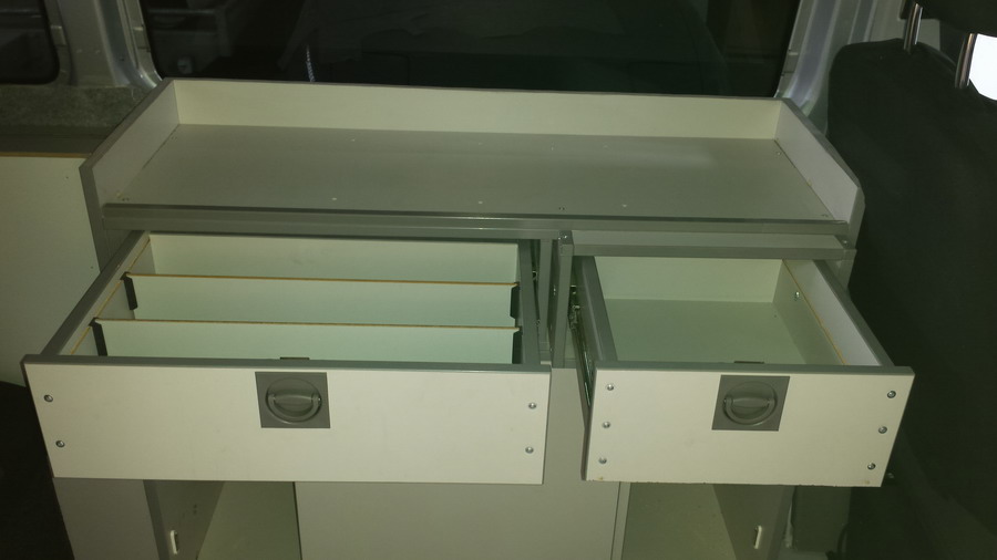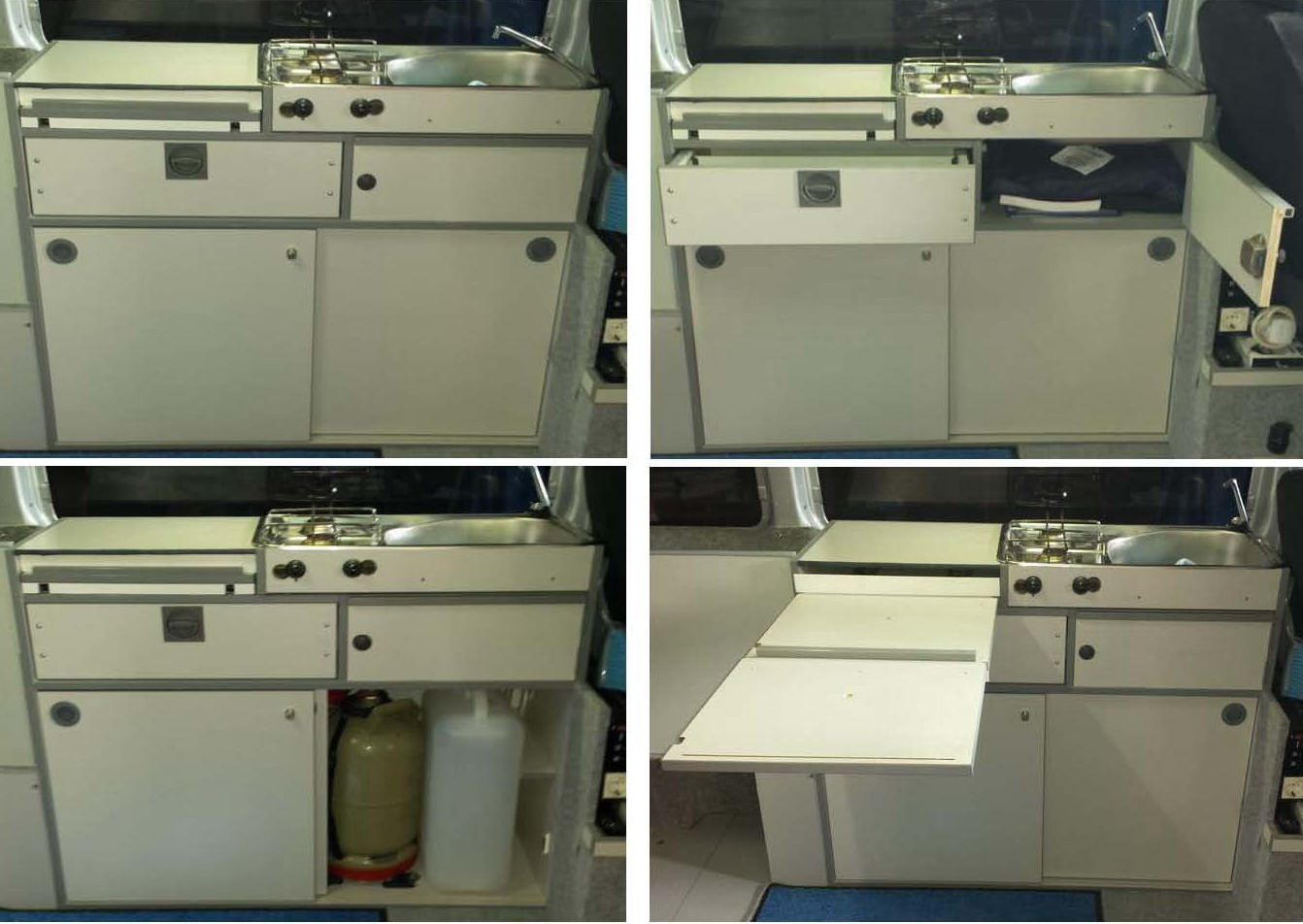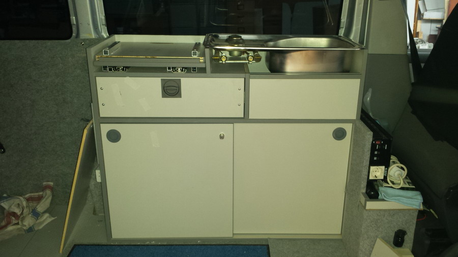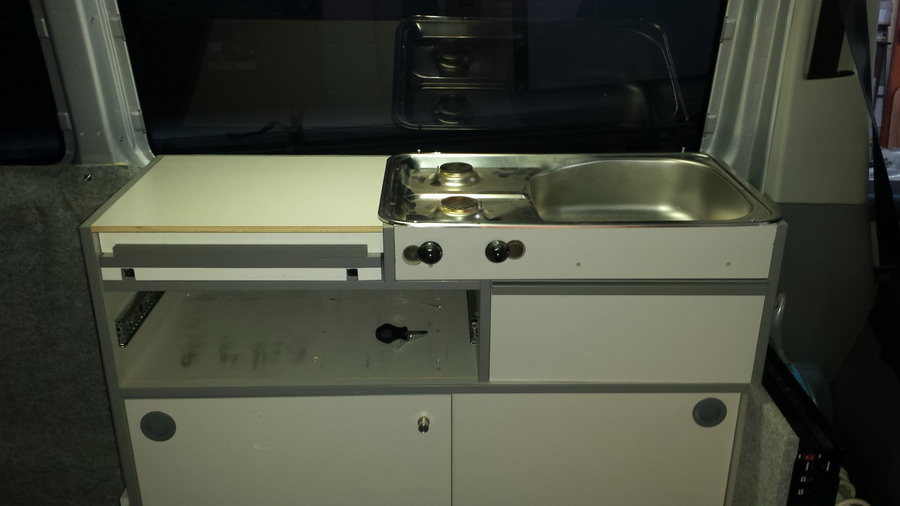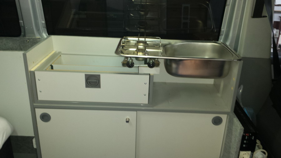 Bedingt durch die Spüle und die notwendigen Frisch- und Abwasserleitungen war rechts der Einbau einer Schublade nicht mehr möglich, sie wurde durch ein Fach unter der Spüle ersetzt. Mit der Vorbereitung des Kochers, der Anpassung des Küchenblocks und der sicheren Befestigung musste auch schon der Verlauf der Gasleitung geprüft und der Standort der Gasflasche festgelegt werden, auch wenn eine Nutzung des Kochers nicht beabsichtigt war.