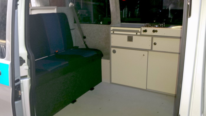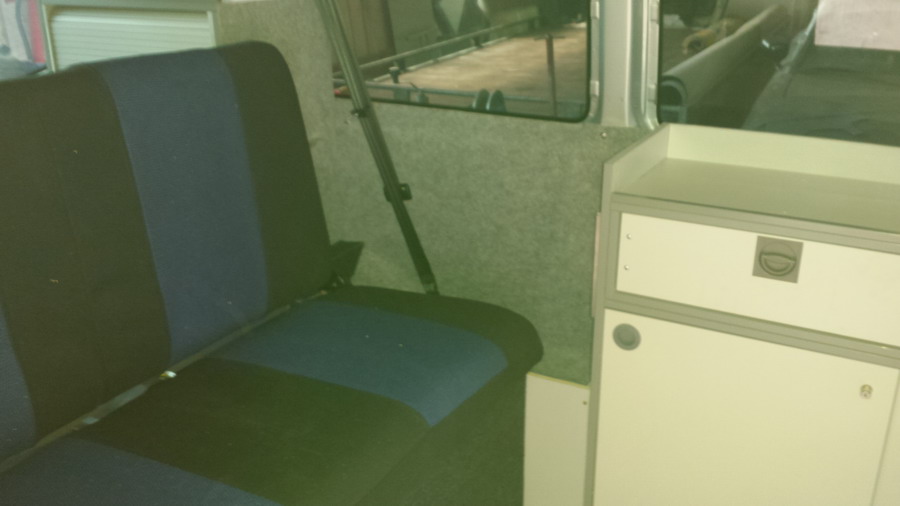 Die original VW-Dreiersitzbank ist klappbar, so ergeben sich die erforderlichen Schlafplätze und damit sind die Vorgaben des TÜV, (Kochgelegenheit, Waschgelegenheit, Schlafgelegenheit, Stauraum und ein Tisch) für die Abnahme als Sonder-Kfz-Wohnmobil erst einmal erfüllt.