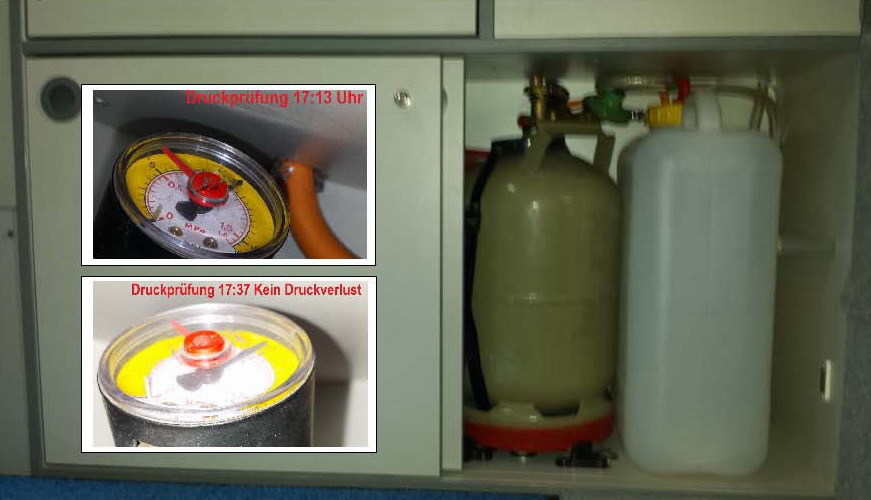 Vom Kocher wurde die Gasleitung zum Regler (50 mbar) gelegt. Um ständig die Dichtigkeit der Anlage prüfen zu können, ist der Regler mit einem Manometer ausgerüstet. Funktions- und Dichtigkeitsprüfung wurden durchgeführt. Abnahme der Gasanlage durch einen Sachverständigen wird zurückgestellt, da die Gasanlage nicht genutzt wird.