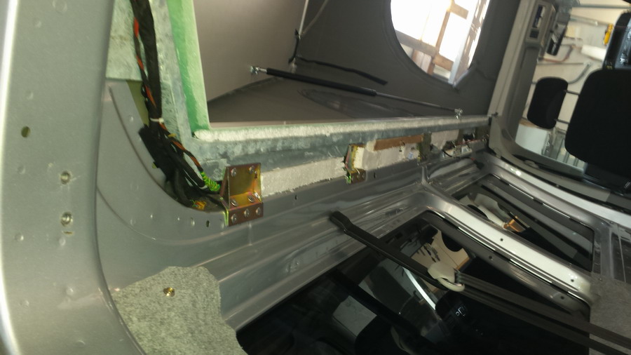 Die Befestigung erfolgte mit Nietmuttern an der D-Säule des Fahrzeugs und mit durchgehenden Schrauben zum unteren Schrankmodul. Später soll der Schrank noch nach hinten zur Heckklappe erweitert werden.