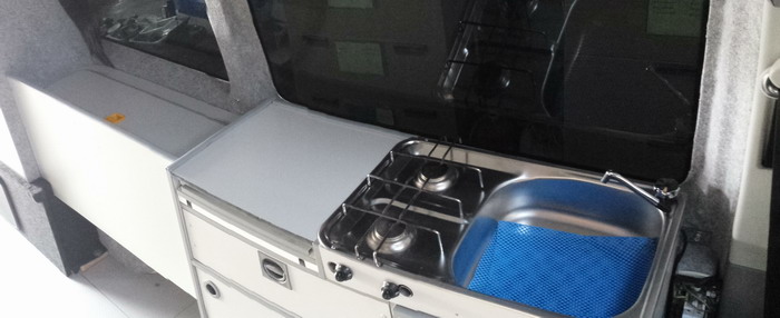 Der Küchenblock steht unmittelbar hinter dem Fahrersitz. Am Küchenblock befindet sich eine Halterung, in der während der Fahrt der Tisch sicher befestigt werden kann.