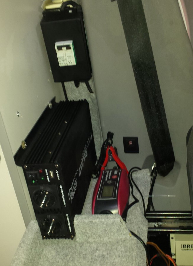 Das Klappdach ist eingebaut, die Beleuchtung perfekt angepasst, nun ist Zeit, die elektrische Anlage etwas zu optimieren. Das Kombigerät Inverter/Ladegerät wurde durch einen hochwertigeren Inverter mit zwei Steckdosen und USB-Anschluß ausgetauscht, so ist es problemlos möglich auch einen 220 Volt-Wasserkocher über die 12-Volt-Anlage zu betreiben. Der Sicherungsautomat der 220-Volt-Anlage (bei "Landstrom") wurde ebenfalls ausgetauscht. Um bei Außenstromanschluß die Batterie aufladen zu können wurde ein neues, besseres elektronisches Ladegerät eingebaut.