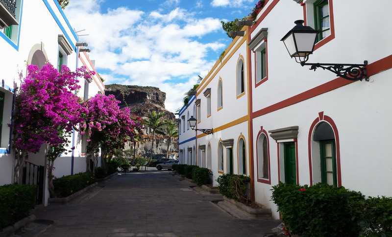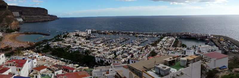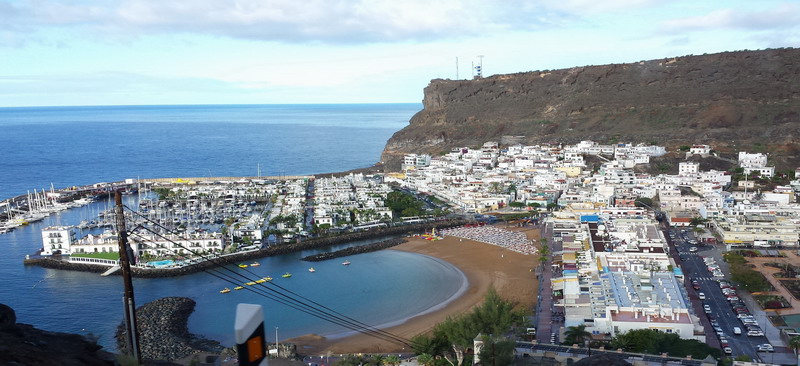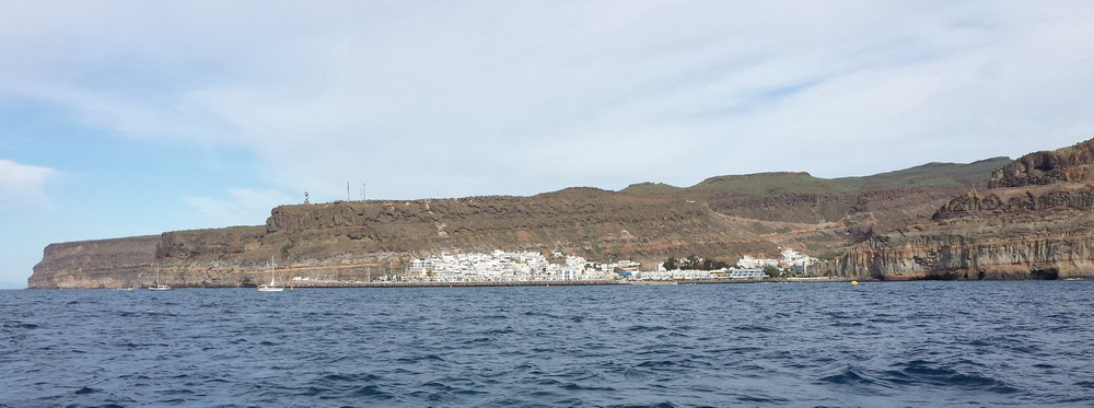 Mogan liegt voraus. Zum Glück ohne hohe Hotelbauten, kleine Appartements, Shops, Geschäfte, kein „All Inclusive“ und kein Massentourismus. Nur im hinteren Teil des Ortes wurden größere Hotelanlagen errichtet, die jedoch das Ortsbild nicht wesentlich verändern.
