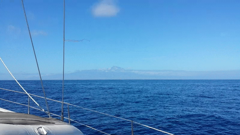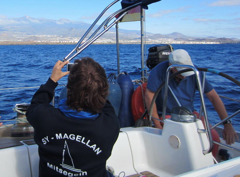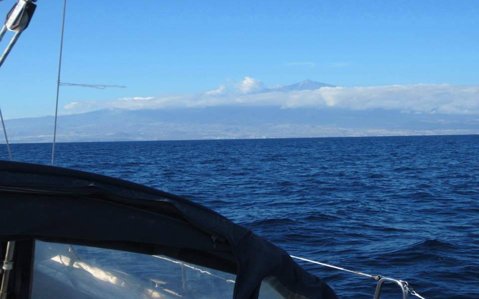 Mit schönem Wind segelten wir in der Atlantikdünung. Ein letzter Blick auf den Teide, (Pico del Teide). Es ist mit 3.718 m Höhe der höchste Berg Spaniens und mit ca. 7.500 m Höhe über dem Meeresboden der dritthöchste Inselvulkan der Erde. Der Vulkan ist noch aktiv, der letzte Ausbruch war 1909, der letzte große Ausbruch 1492.