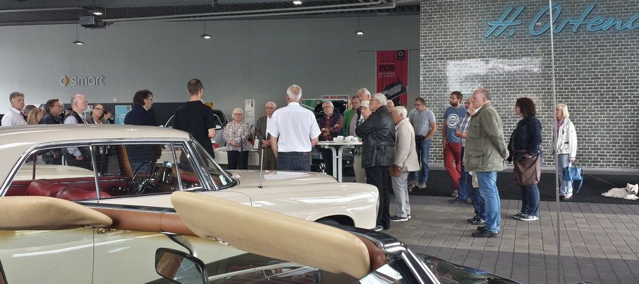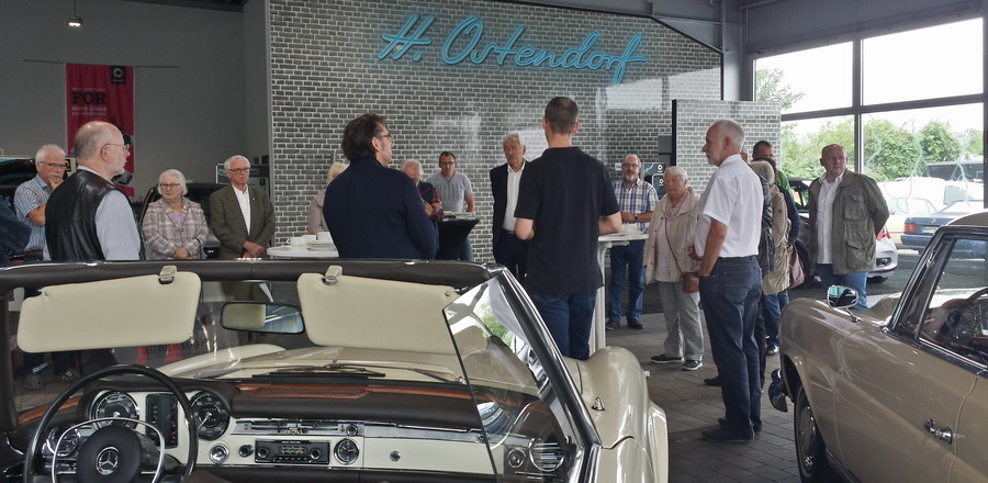 Bei Kaffee und Brötchen hörten wir kurzweilige Berichte von der Gründung des Unternehmens im Jahr 1937 als Tankstelle und Reparaturwerkstatt in Ahlen, Übernahme einer Mercedes Vertretung bereits im Jahr 1938, bis zur Gründung des Classic-Centers mit eigenem Verkaufsraum und eigenem Werkstattgebäude in Hamm.