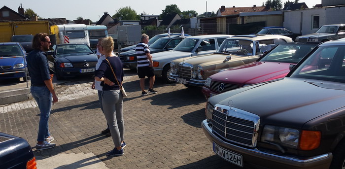 34 Fahrzeuge, u.a. Modelle der Serien 124, 126, 140 und 129 standen bald auch wie in einem Museum auf dem Hof und konnten besichtigt werden. Auch ein 850er BMW hatte sich zwischen die „Sterne“ verirrt und viele Gäste bestaunten den „Fremdling“, einst auch ein exklusives Fahrzeug seiner Zeit.
