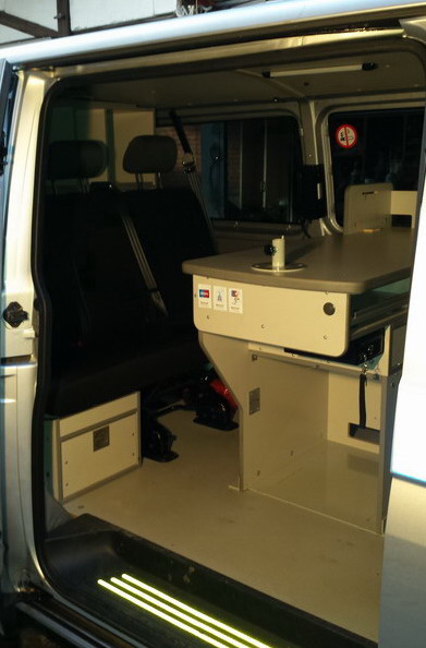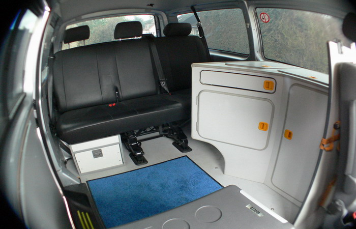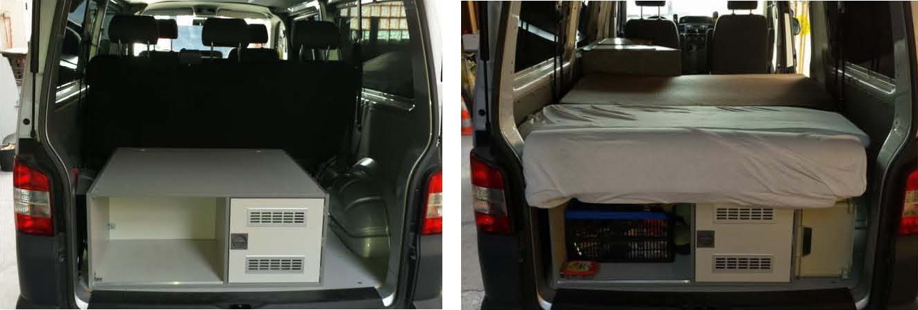 Der vollständige Umbau ist mit etwas Übung in wenigen Minuten zu erledigen und so wird aus dem „Transportfahrzeug“ ein multivariables „Freizeitfahrzeug“ oder ein Arbeitsvan. Von außen nicht erkennbar.