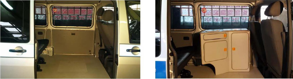 Die vorhandene Büroeinrichtung und sämtliche Schränke im Heck des Fahrzeugs wurde ausgebaut. Die Brennstoffzelle und Zusatzbatterie, montiert im Kofferraum, wurden demontiert, da sie nach Umbau an einem anderen Standort platzsparend eingebaut werden sollen.