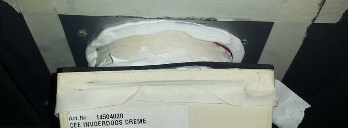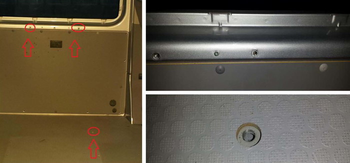 Leider stellte sich nach Entfernung der Verkleidungen heraus, dass die serienmäßige Innendämmung, bestehend aus verklebten Filz-Matten, sich teilweise gelöst hat und abgefallen war. Die heruntergefallenen Matten wurden, jetzt mit Acryl-Klebstoff neu befestigt. (Keinen Silikon-Klebstoff verwenden !!)