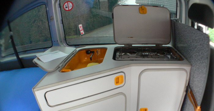 Der Küchenblock steht unmittelbar hinter dem Fahrersitz. Am Küchenblock befindet sich eine Halterung, in der während der Fahrt der Tisch sicher befestigt werden kann.