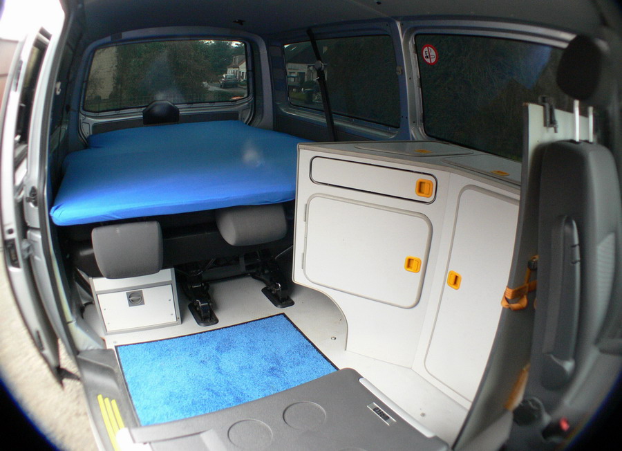 - vollständiger Campingvan mit bis zu vier Schlafplätzen, drehbarem Beifahrersitz sowie einer Schlaf-Klappsitzbank für 2, notfalls 3 Personen (ohne Eintragung).