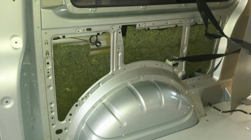 Durch beinahe vollständiges Ausfüllen der Hohlräume wurde so auch eine bessere Geräuschdämmung erreicht. Hohlräume in Fahrzeugen wirken wie der Resonanzraum in einer Gitarre. Sämtliche Fahrgeräusche werden "verstärkt" und in vielen Campingbussen ist es auf schlechten Straßen laut wie im inneren einer Glocke. Als Dampfsperre wurde eine Folie eingeklebt.