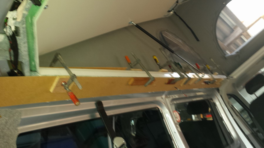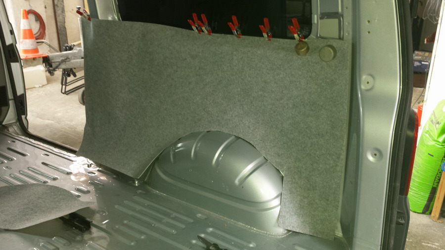 Die Sitzbank wurde probeweise an den vorbereiteten Verankerungspunkten befestigt und der weitere Ausbau im Heckbereich wurde vorbereitet. Hinter der Sitzbank wurde eine stabile Zwischenwand, bestehend aus einer Tischlerplatte vorbereitet, die als Auflage der Matratzenunterlage im Heck dienen soll. Die Platte wird im Fahrzeugboden verschraubt, nach vorn wird sie mit einer Trennwand über dem Radkasten verankert, hinten erfolgt die Befestigung direkt an der D-Säule des Fahrzeugs.