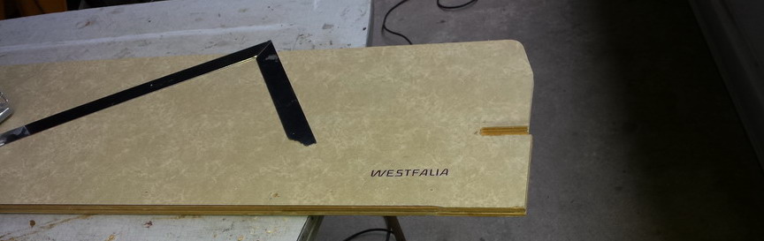 Nachdem Spüle und Kocher im Küchenblock sicher befestigt waren, wurde eine Schablone für die Frontverkleidung um die Bedienteile hergestellt, die Verkleidung gesägt, diverse Löcher gefräßt sowie die Abdeckung und der Verkleidung der "Tischgarage" hergestellt.