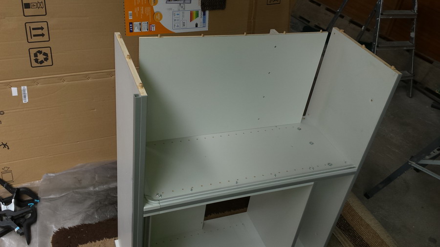 Der Umbau der qualitativ sehr hochwertigen Schränke war komplizierter als gedacht, da viele Schrauben und Verzapfungen von außen nicht erkennbar waren und die Schrankteile teilweise auch verleimt waren.