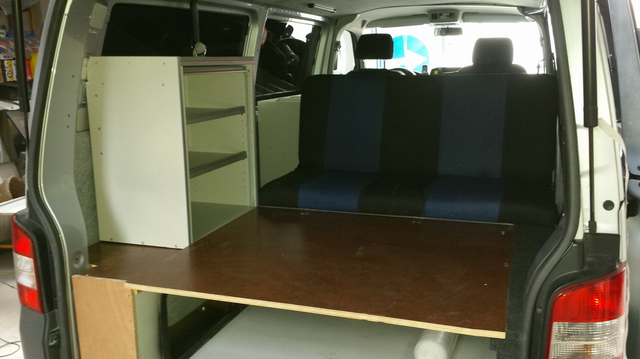 Der Möbelbau erfolgte nun mit der Fertigstellung der Bettverlängerung im Fahrzeugheck. Dabei wurden auch die Radkästen isoliert und verkleidet. Für den Möbelbau in einem Campingbus sollten keine Spanplatten verwendet werden sondern mehrfach verleimte Multiplexplatten. oder Tischlerplatten, mindestens "normales" wasserfest verleimtes Sperrholz. Besonders geeignet, da sehr leicht, sind leichte Multiplexplatten aus Pappelholz.