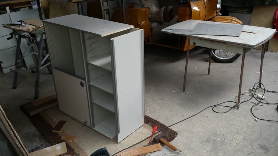 Als nächstes sollte der Küchenblock hergestellt werden. Auch aus einem BAG-Büroschrank, der entsprechend umgearbeitet werden musste.