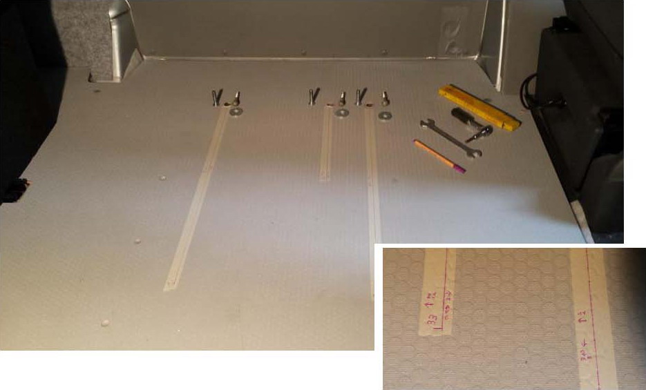 Um sichere Befestigung zu gewährleisten sollten Sitzbank und Möbel möglichst an Original-Verankerungspunkten oder mit stabilen Nietmuttern befestigt werden. So ist auch ein problemloser und schneller Ausbau der Einrichtung gewährleistet. Um einen Überblick zu erhalten wurden die Umrisse zunächst durch Klebeband markiert.