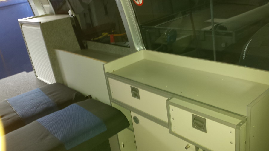 Die original VW-Dreiersitzbank ist klappbar, so ergeben sich die erforderlichen Schlafplätze und damit sind die Vorgaben des TÜV, (Kochgelegenheit, Waschgelegenheit, Schlafgelegenheit, Stauraum und ein Tisch) für die Abnahme als Sonder-Kfz-Wohnmobil erst einmal erfüllt.
