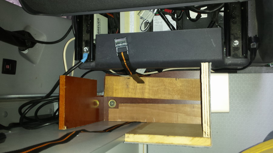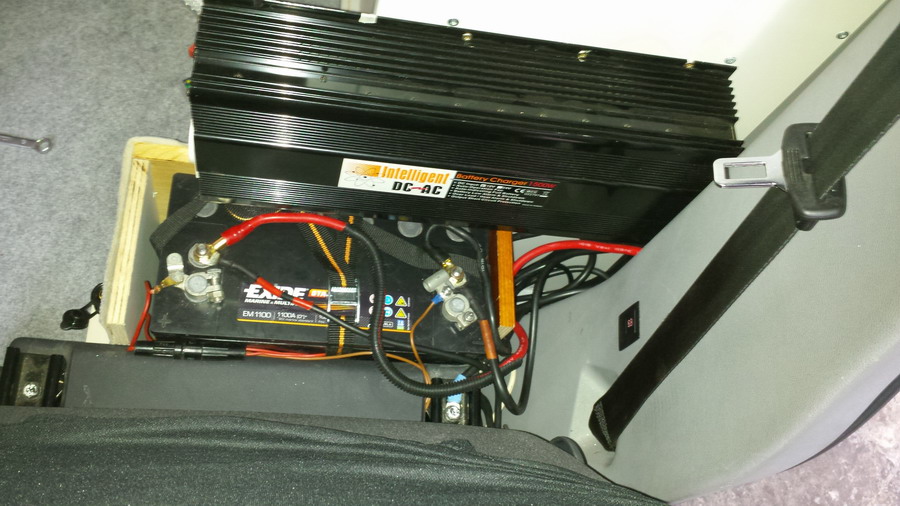 Nun konnte auch die zweite Batterie wieder eingebaut werden. Der Einbau erfolgte unmittelbar hinter dem Fahrersitz. Der Batterieschrank wurde durch den Boden so verschraubt, dass auch hier ein schneller Ausbau gewährleistet ist. Verkleidung erfolgte später mit Rips-Material.