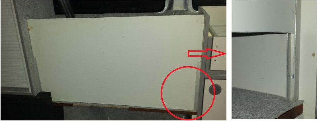 Auf der rechten Fahrzeugseite wurden beim Einbau der Bettverlängerung auch kleine Stauräumen für die Aufnahme des Bordwerkzeugs, Stromkabel, Stecker usw. eingerichtet. Auf der rechten und linken Fahrzeugseite dienen die Staufächer auch zur Aufnahme der Polsterunterlage für die Bettverlängerung.