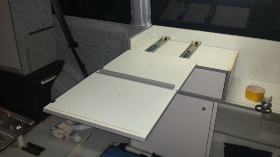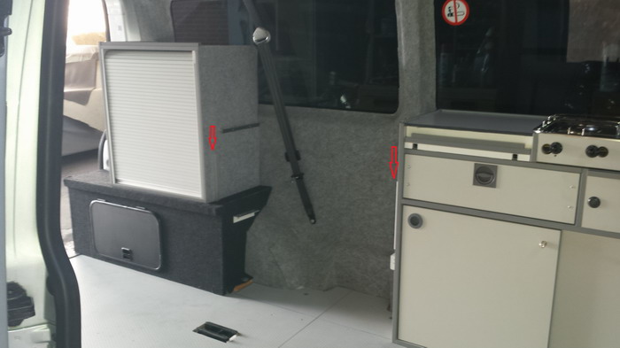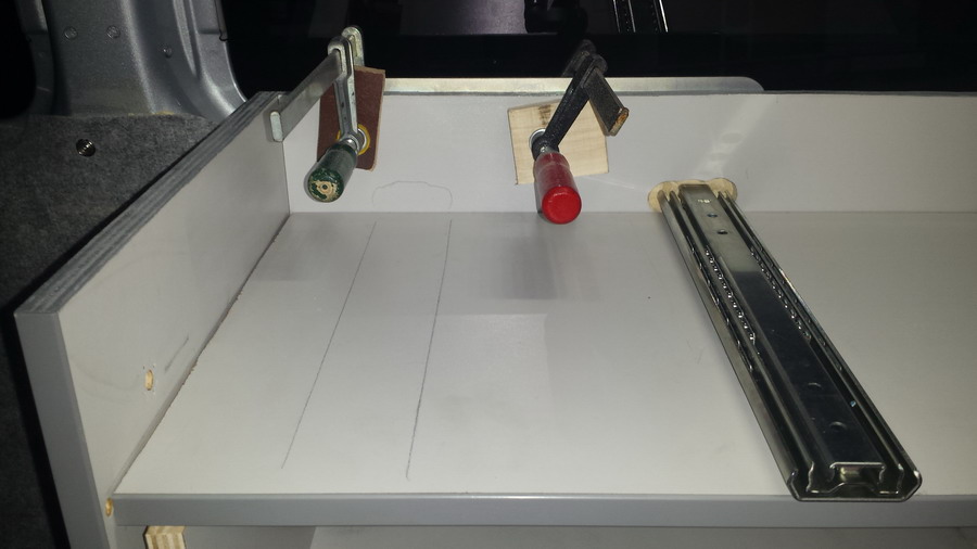 Es folgte der Einbau des Zwischenschrankes neben der Sitzbank. Dieser Schrank soll mit dem Heckschrank und dem Küchenblock verbunden werden, damit er ebenfalls schnell ausgebaut werden kann.