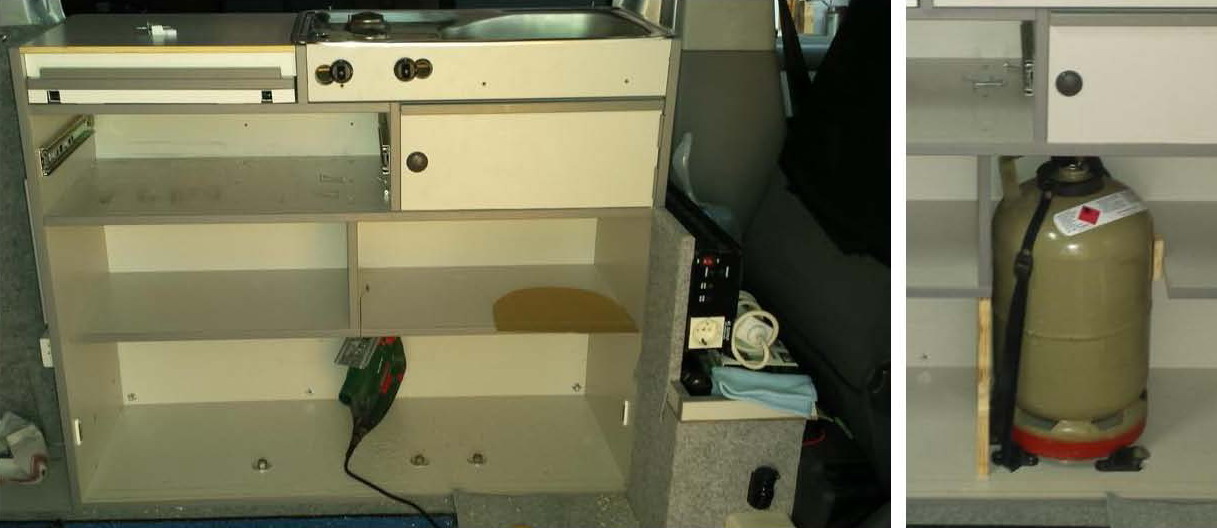 Die nächsten Schritte zum Ausbau des Campingvans waren die Vorbereitung einer Gasflaschenhaltung und die vorbereitende Installation der Gasleitungen. Eine Möglichkeit zur Unterbringung einer 6 kg Propangasflasche wurde im Küchenblock geschaffen, indem ein passender Ausschnitt gesägt wurde. Die Flasche wird im Ausschnitt mit Gurten gehalten. Neben der Gasflasche befindet sich Platz für einen Frischwasserkanister mit ca. 20 ltr. Inhalt.