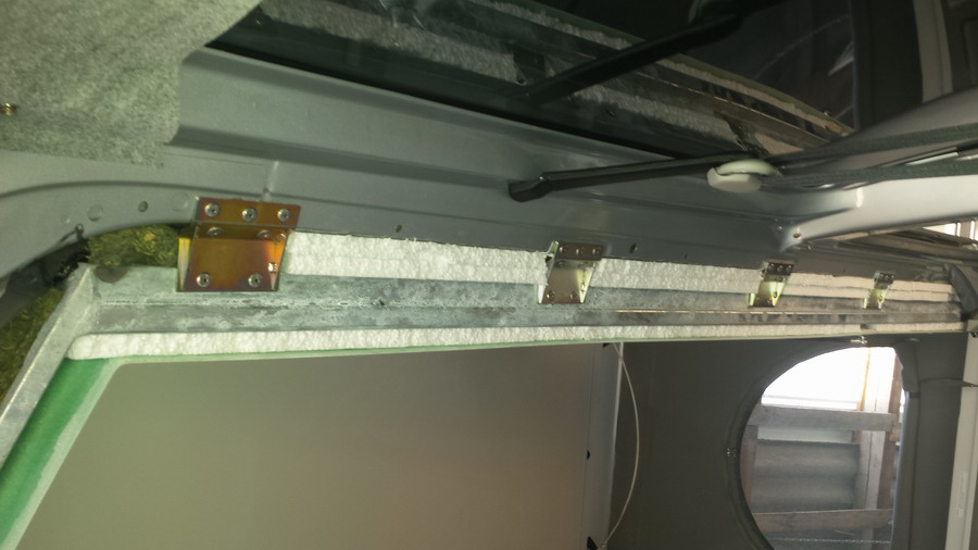 Die Befestigung erfolgte mit Nietmuttern an der D-Säule des Fahrzeugs und mit durchgehenden Schrauben zum unteren Schrankmodul. Später soll der Schrank noch nach hinten zur Heckklappe erweitert werden.
