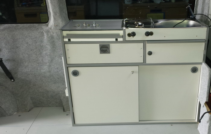 Bedingt durch die Spüle und die notwendigen Frisch- und Abwasserleitungen war rechts der Einbau einer Schublade nicht mehr möglich, sie wurde durch ein Fach unter der Spüle ersetzt. Mit der Vorbereitung des Kochers, der Anpassung des Küchenblocks und der sicheren Befestigung musste auch schon der Verlauf der Gasleitung geprüft und der Standort der Gasflasche festgelegt werden, auch wenn eine Nutzung des Kochers nicht beabsichtigt war.