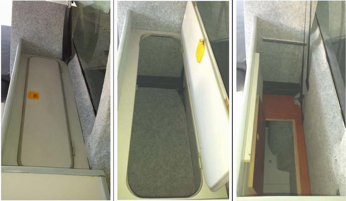 Die Besonderheit ist jedoch ein „Geheimfach“ unter dem Boden. Das Fach ist nur zugänglich nachdem die Innenverkleidung des Staufachs angehoben wird.