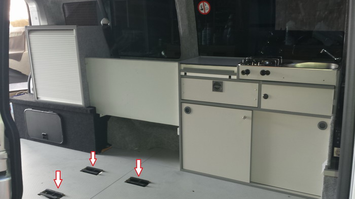 Mit nur fünf Schrauben wird der Küchenblock im Fahrzeug verankert. Drei Verschraubungen im Fahrzeugboden, zwei Verschraubungen im oberen Teil der Seitenwand.