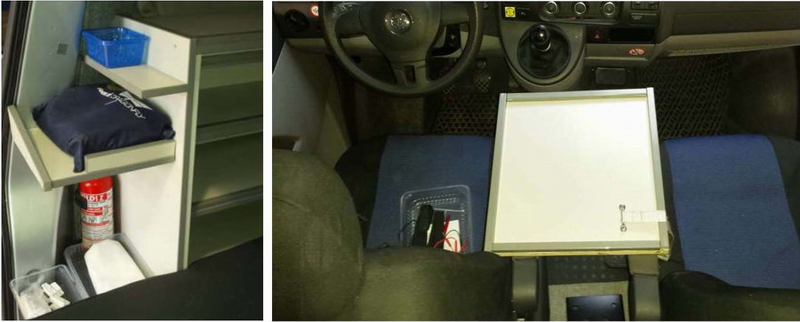 Nachdem nun die elektrische Anlage optimiert war, wurden hinter dem Heckschrank, hinten links, noch zusätzliche Ablagefächer eingebaut sowie eine Halterung für einen weiteren Feuerlöscher. Ein praktisches Tablett, während der Fahrt auch als "Tisch" zwischen Fahrer- und Beifahrersitz zu nutzen fehlt nun auch nicht mehr.