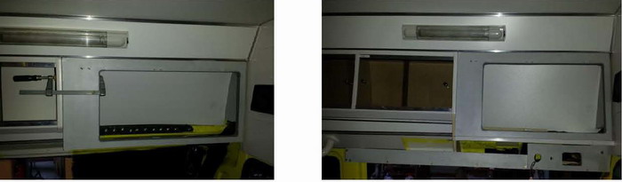- zwei Fenster, wie oben, davon ein Schiebefenster mit großer Öffnung, rechte Fahrzeugseite