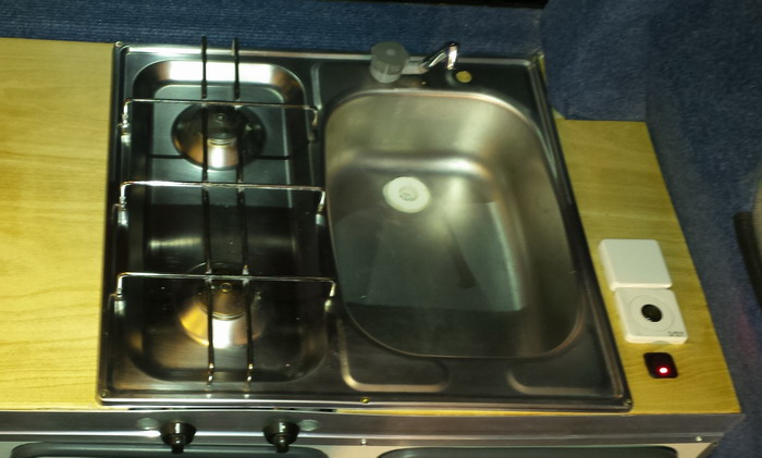 Zweiflügliger Küchenblock, Edelstahlspüle, Gas-Zweiflammkocher, 12-Volt Wasser-Tauchpumpe, Frisch- und Abwasserkanister, 5 kg-Gasflasche (Abnahme erforderlich), 12 Volt + 220 Volt Steckdosen