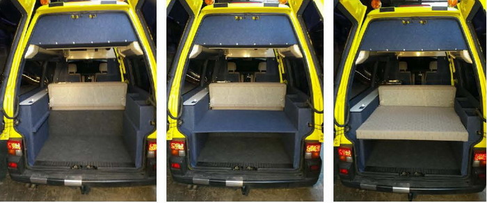 weiterer Stauraum rechts, neben dem Campingbett hinten, mit Ablagefächern