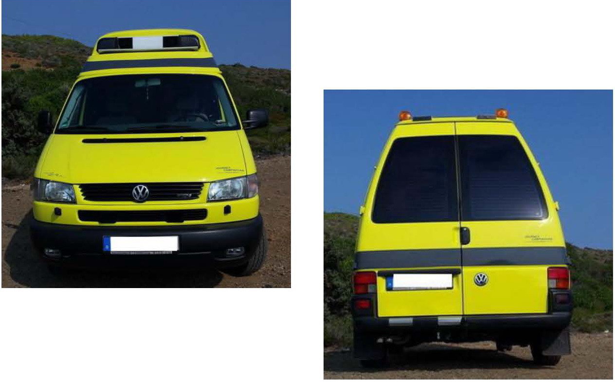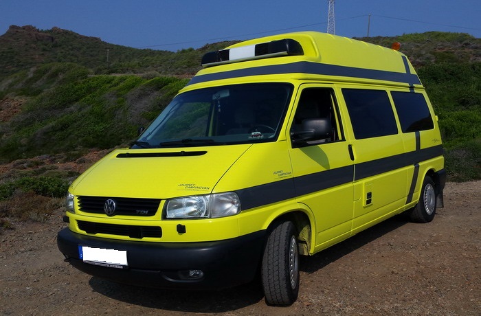 Der VW T 4 wurde im Jahr 2001 produziert und von WAS (Wietmarscher Ambulanz- und Sonderfahrzeug-GmbH) zu einem Patienten-Transportwagen erweitert und umgebaut. Das Fahrzeug wurde vom Deutschen Roten Kreuz als Kranken-Rückholfahrzeug eingesetzt, d.h. erkrankte Personen wurden aus Krankenhäusern im Ausland zurück an ihren Wohnort verbracht. (Langstreckenfahrten)